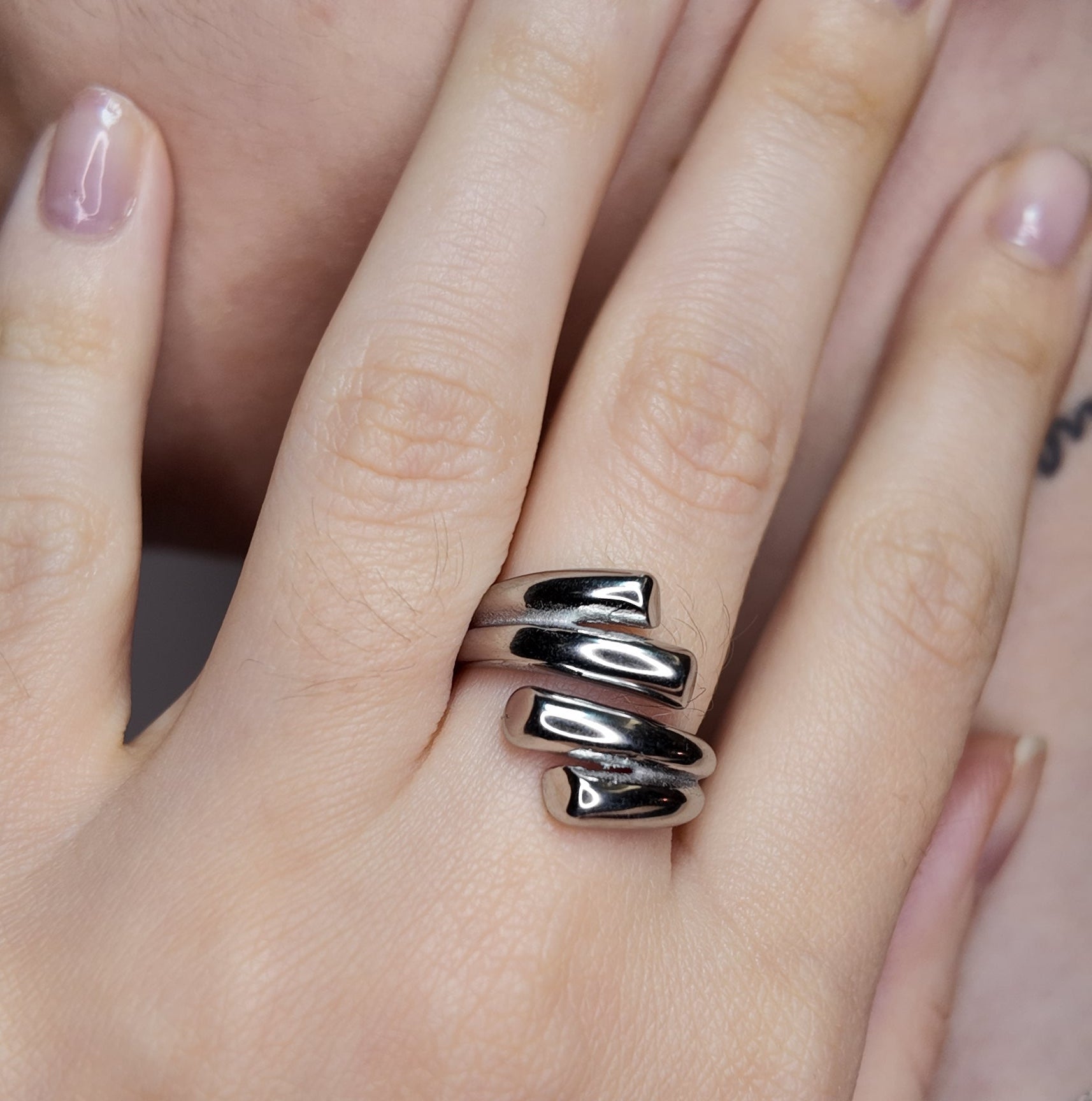 Experience modern elegance with our Embrace Ring. Crafted from durable stainless steel, this open-style ring features two distinct, medium-chunky lines with smooth, rounded ends that appear to delicately hug and wrap around your finger.